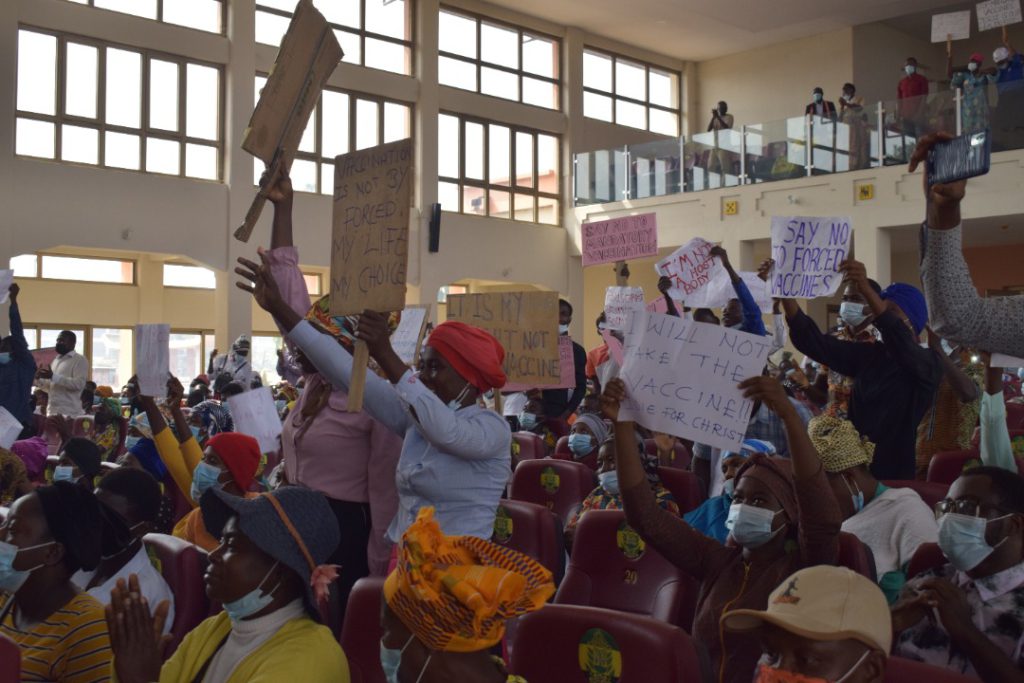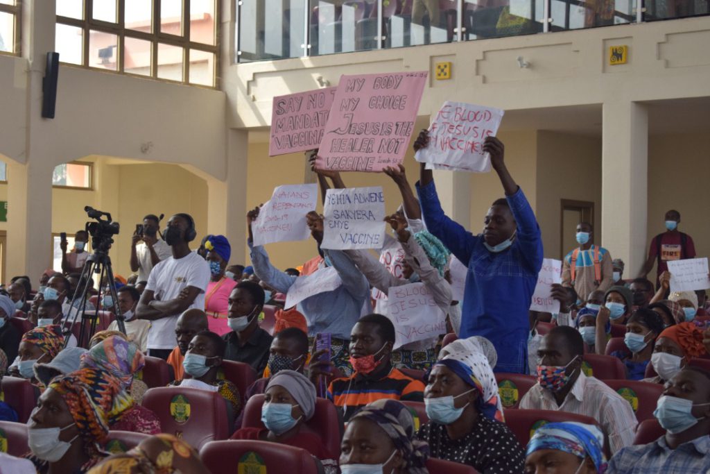 Members held placards with inscriptions: “No forced vaccination", "my body, my right”, “the blood of Jesus is our vaccine”, among others.