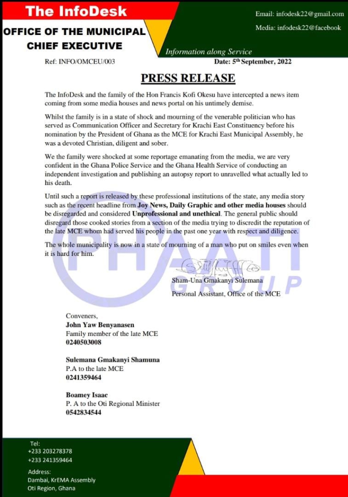 The family of the late Krachi East Municipal Chief Executive (MCE), Francis Kofi Okesu, says they are unhappy with media reports on the circumstances surrounding his death.