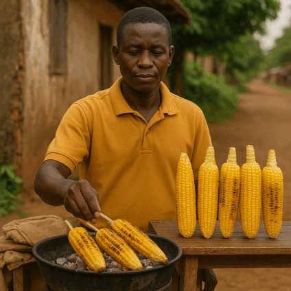 Unlike the peeled and buttered versions seen elsewhere, Ghanaian roasted corn is traditionally grilled whole directly on the cob. Vendors line up rows of semi-dried maize over open charcoal fires, turning them carefully until each cob is evenly roasted.