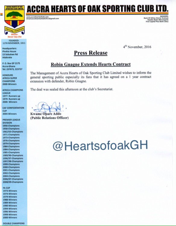 Hearts of Oak captain Robin Gnagne has signed a one year contract extension that will keep him at the club until 2017.