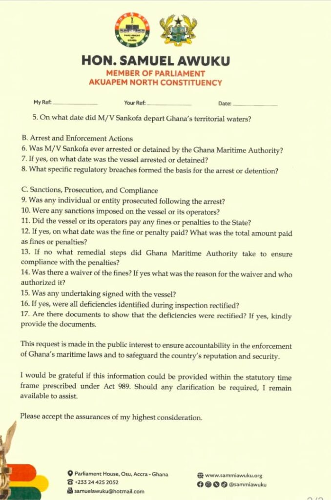 In a detailed request addressed to the Chief Executive of the Ghana Maritime Authority, the MP is seeking clarification on the vessel’s entry, detention, regulatory compliance, and eventual departure from Ghanaian waters.