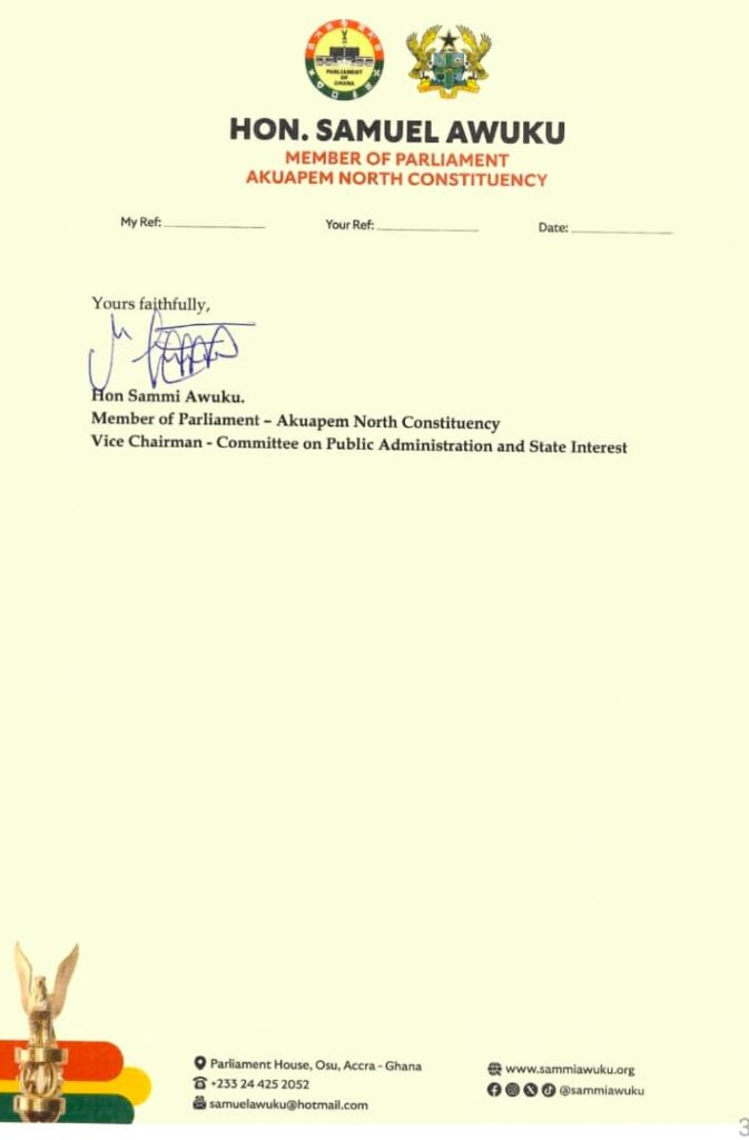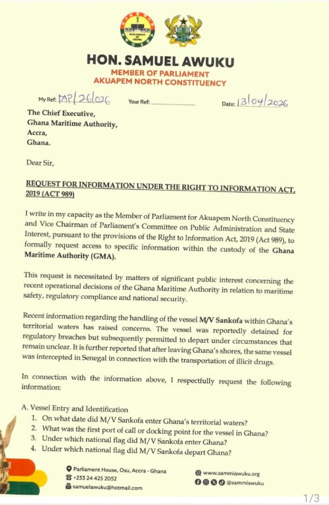 Akuapem North MP and Vice Chairman of Parliament’s Committee on Public Administration and State Interests, Sammi Awuku, has formally invoked the Right to Information Act, 2019 (Act 989), to demand detailed records from the Ghana Maritime Authority (GMA) over the handling of a controversial vessel, MV Sankofa.