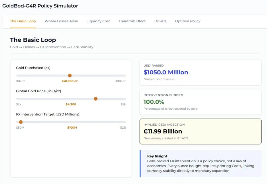 Through the simulations we have started to roll out, it becomes clear that there’s a policy tightrope: Ghana can push certain levers to gather more gold and seek to stabilize the currency, but pushing those same levers too far inflates the cost of the intervention. The dashboard-widget we have implemented visually underscores the core trade-off: aggressive currency support vs. financial losses.
