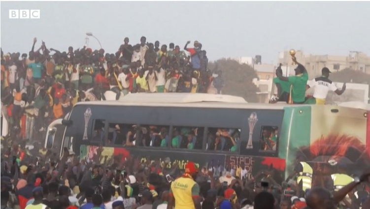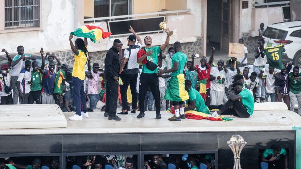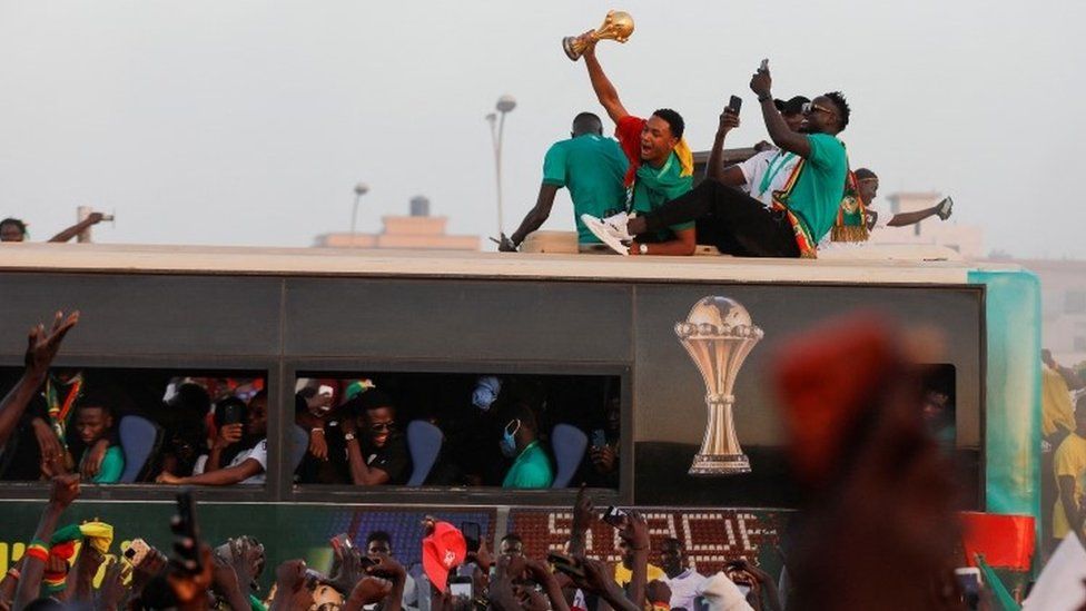 The victory bus paraded the national team from the airport to the centre of Dakar, Senegal's capital of three million people.