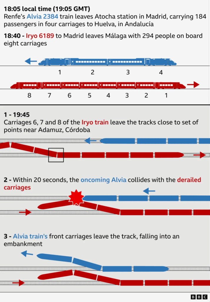 A derailment near Santiago de Compostela in 2013 that killed 80 people was not part of the AVE network, although that train was travelling at high speed. Sunday's collision, however, took place on the oldest AVE route, that which connects Madrid with Andalusia.