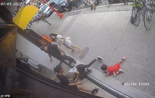 This is the shocking moment when a mother and her toddler were hit and knocked over by a man sprinting down a sidewalk in Vancouver’s Chinatown.