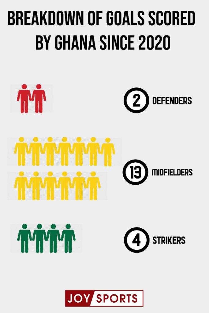Four midfielders; Wakaso, Partey, Kudus, and Andre Ayew have scored the majority of Ghana’s goals since a striker last scored for the Black Stars.