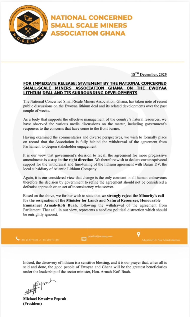 The National Concerned Small-Scale Miners Association of Ghana has thrown its full weight behind the government’s decision to withdraw the Ewoyaa lithium agreement from Parliament for further review, describing it as “a step in the right direction.”