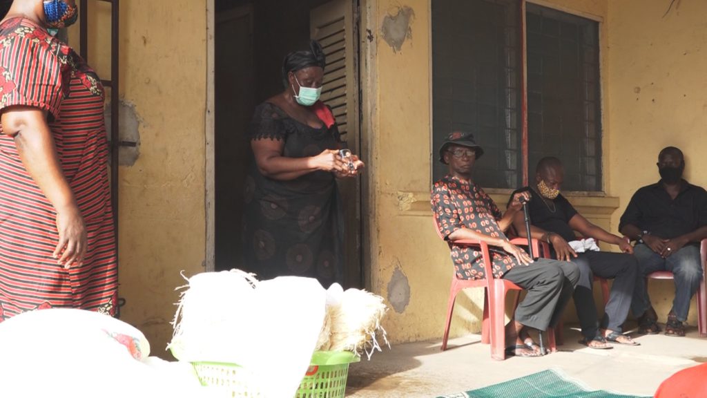 Chewing sponge, some clothes of the deceased and cloths, soap, towel and other sanitary items are used to perform the Kotsagbamo rite. Before the outbreak of Coronavirus in Ghana, this ceremony was characterised by the extravagant display of wealth amid loud music and celebration but this time around, the rite was performed devoid of all that.