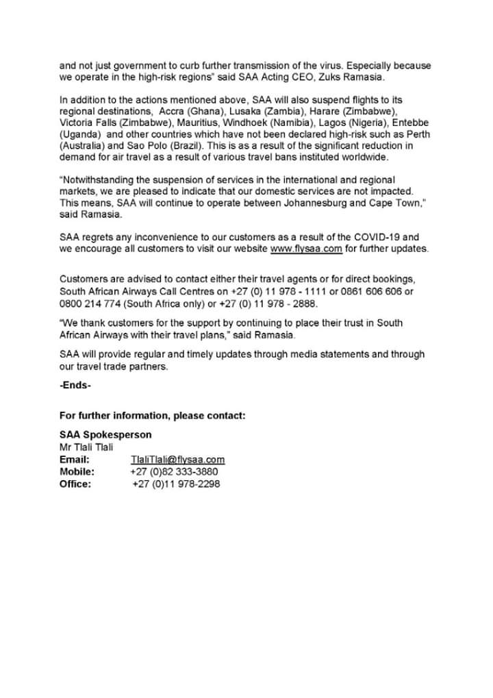 “The suspension of flights follows the gazetting of regulations and the issuing of a Notice to Air Men (NOTAM), an official government notice prohibiting the embarkation and dismemberment of crew and passengers from SAA’s three international destinations,” a statement copied to JoyNews indicated.