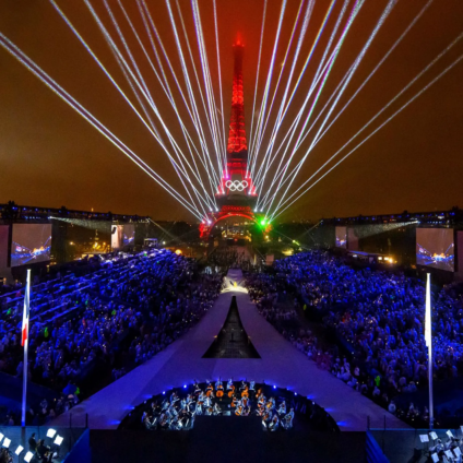 Thousands of athletes and performers paraded along the River Seine on a wet evening, before the night sky and the Eiffel Tower were lit up in dramatic technicolour, creating a hugely ambitious, one-of-a-kind spectacle.