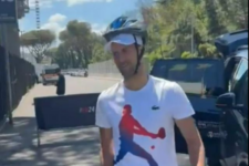 Djokovic greets fans with a helmet after being hit by bottle