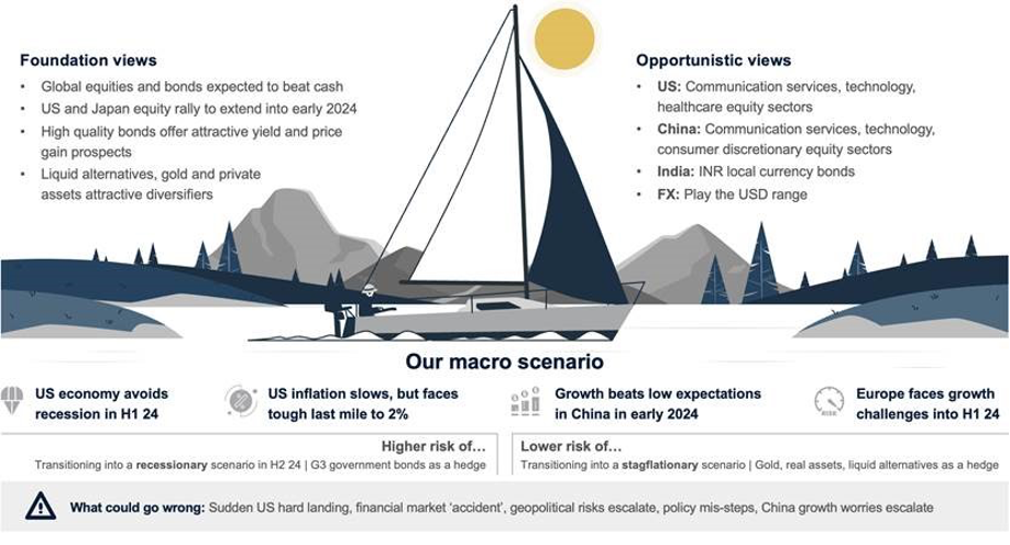 For Foundation allocations – a model that can be used as a starting point for building a diversified investment portfolio – its highest convictions are in (i) high-quality Developed Market government bonds, particularly with longer maturities, (ii) global equities heading into early 2024, led by the US and Japan, and more broadly (iii) global equities and global bonds, which are likely to deliver cash-beating performance.