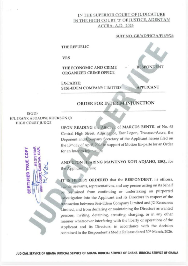 On April 14, 2026, the High Court of Ghana, in the exercise of its supervisory jurisdiction over the Economic and Organised Crime Office ("EOCO"), issued an Order of Interim Injunction restraining EOCO, its officers, and all persons acting on its behalf from declaring or maintaining the directors of Sesi-Edem Company Limited (the “Company”) as “wanted persons” in connection with the transaction between the Company and JG Resources Ltd.
