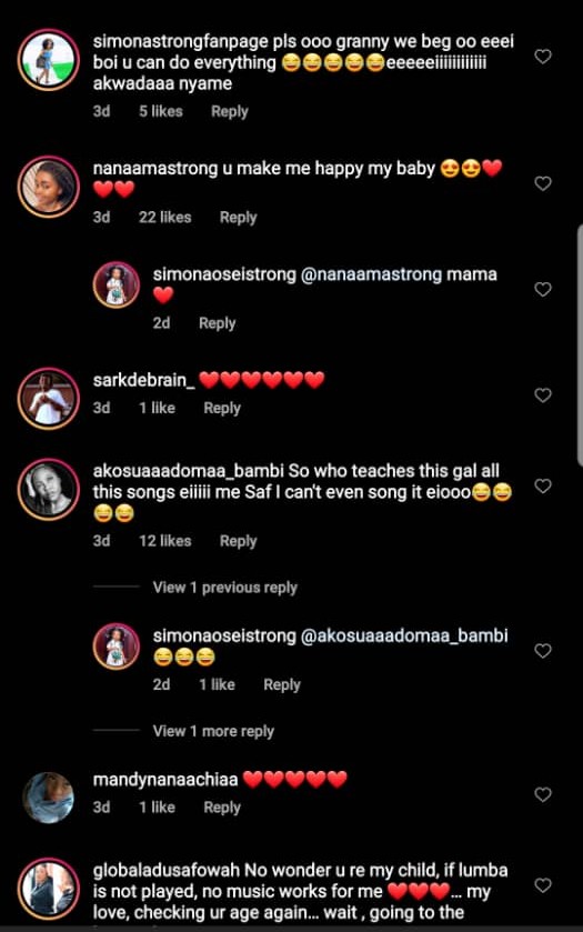 In a video posted on Instagram, the little Simona was seen lip-syncing to the Highlife Legend's 'Mpempem'.