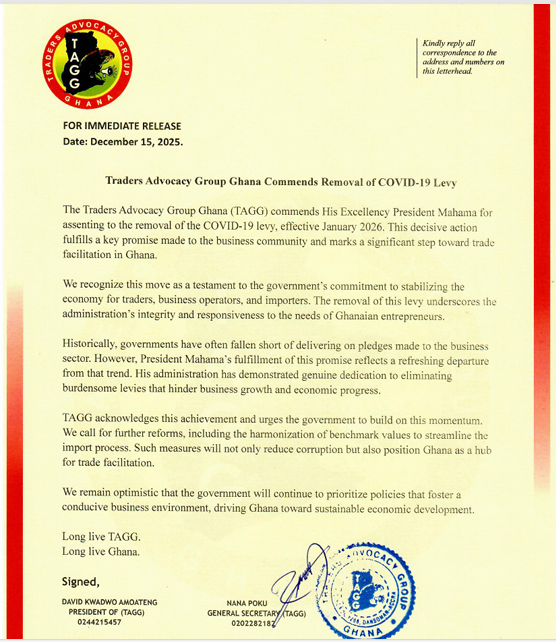 The Traders Advocacy Group Ghana (TAGG) has praised President John Dramani Mahama for assenting to the removal of the COVID-19 levy, which takes effect in January 2026.