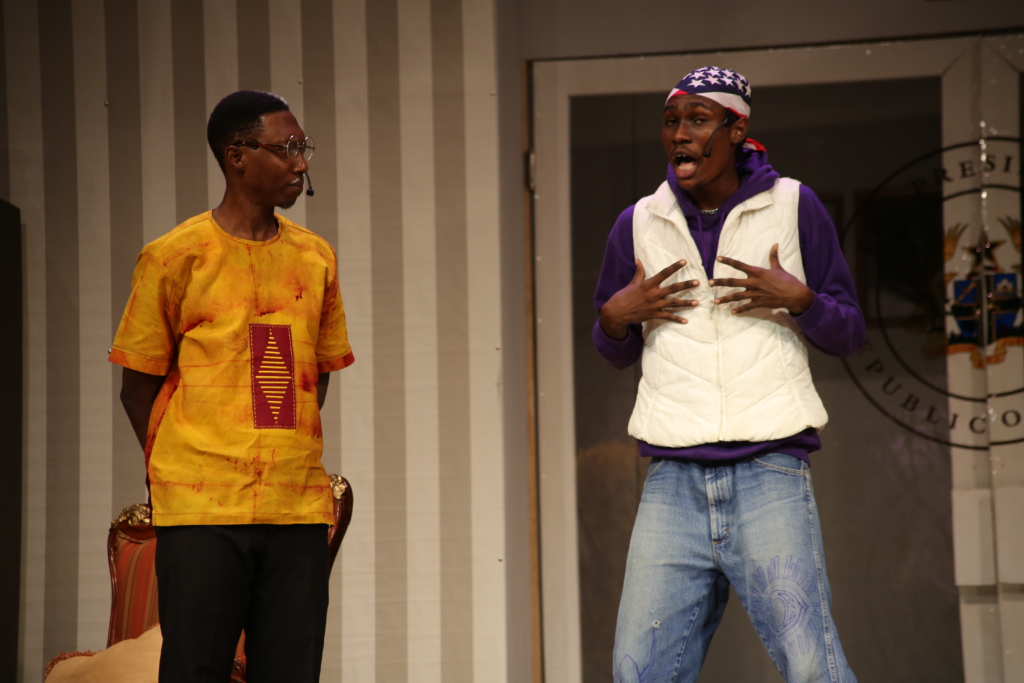 The President is seated in his office working when the Chief of Staff enters, together with Abena, his secretary. Just in the opening scene, Abena’s clumsiness comes to bear. She drops the President’s breakfast. In her bid to tidy up the office, she hits the Chief of Staff with the mop. The Chief of Staff directs her to get out of the office.