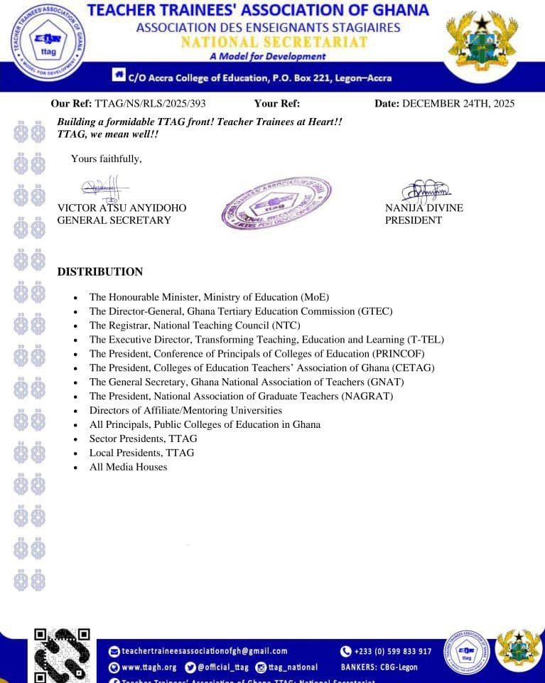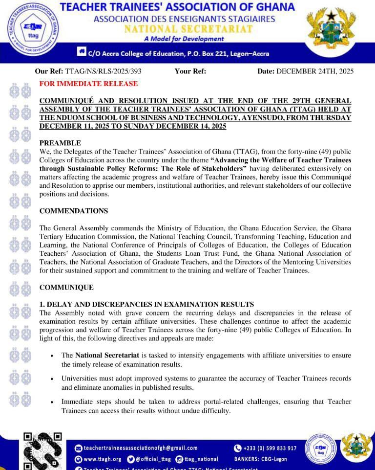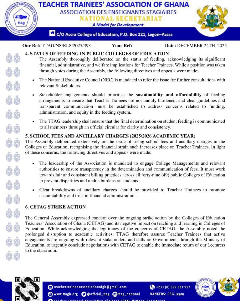 “The General Assembly commends the Ministry of Education, the Ghana Education Service, the Ghana Tertiary Education Commission, the National Teaching Council, Transforming Teaching, Education and Learning, the National Conference of Principals of Colleges of Education, the Colleges of Education Teachers' Association of Ghana, the Students Loan Trust Fund, the Ghana National Association of Teachers, the National Association of Graduate Teachers, and the Directors of the Mentoring Universities for their sustained support and commitment to the training and welfare of Teacher Trainees," the statement read.