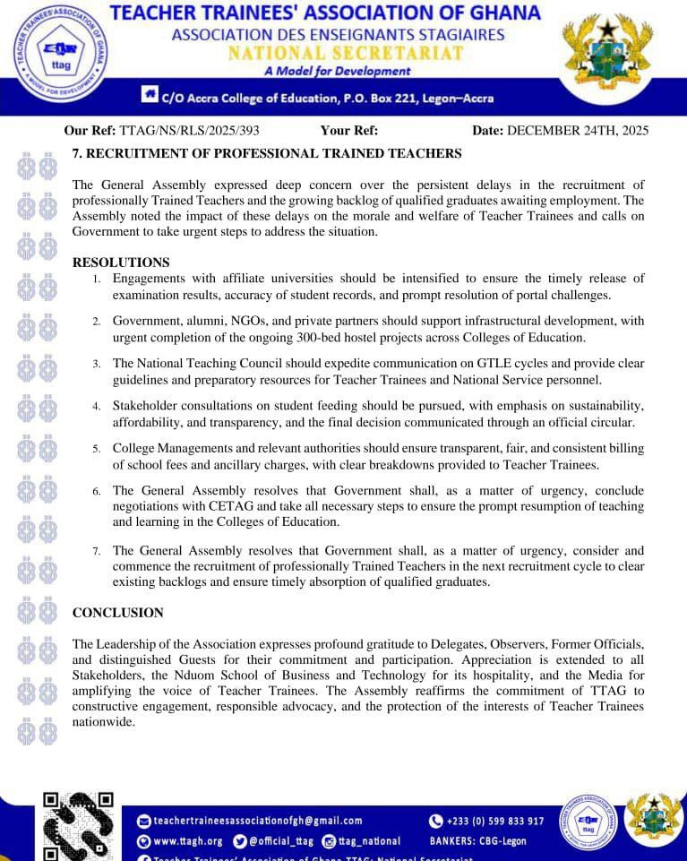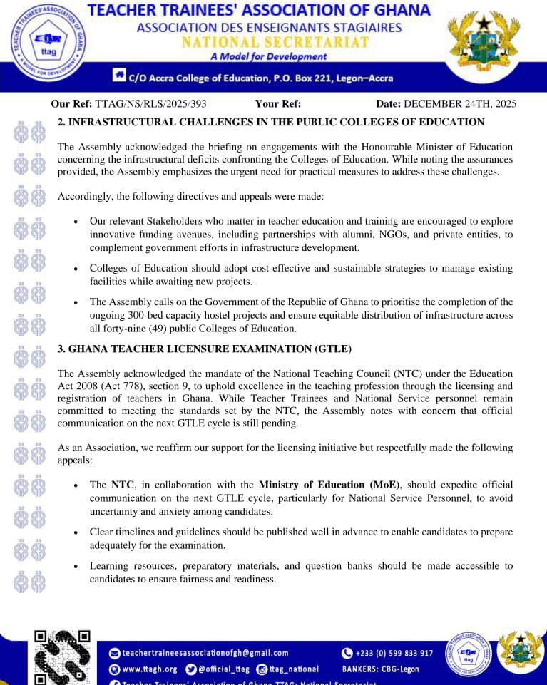 "The Assembly acknowledged the mandate of the National Teaching Council (NTC) under the Education Act 2008 (Act 778), section 9, to uphold excellence in the teaching profession through the licensing and registration of teachers in Ghana. While Teacher Trainees and National Service personnel remain committed to meeting the standards set by the NTC, the Assembly notes with concern that official communication on the next GTLE cycle is still pending."