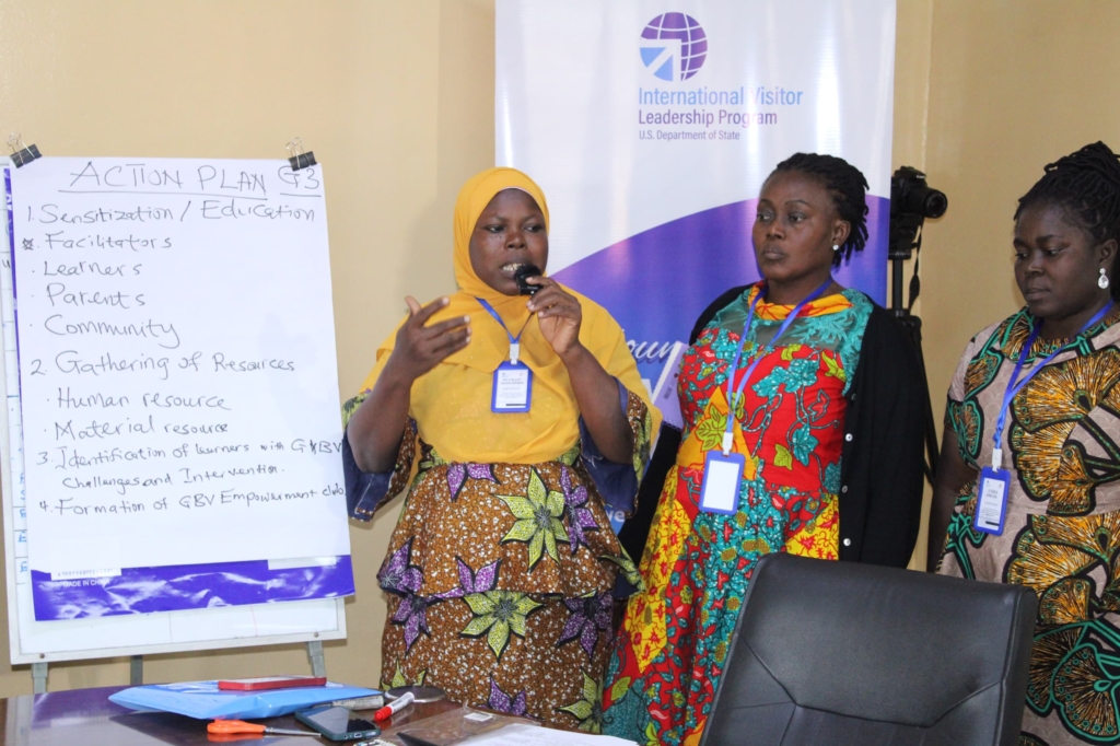The IVLP Impact Awardee and Founder of Missing Children Ghana, Regina Asamoah conducted a session on effective communication strategies for addressing GBV in schools. She introduced the Role-Playing Teaching Technique as an effective tool for age-appropriate and inclusive communication, where learners are encouraged to “act out” their experiences of GBV.
