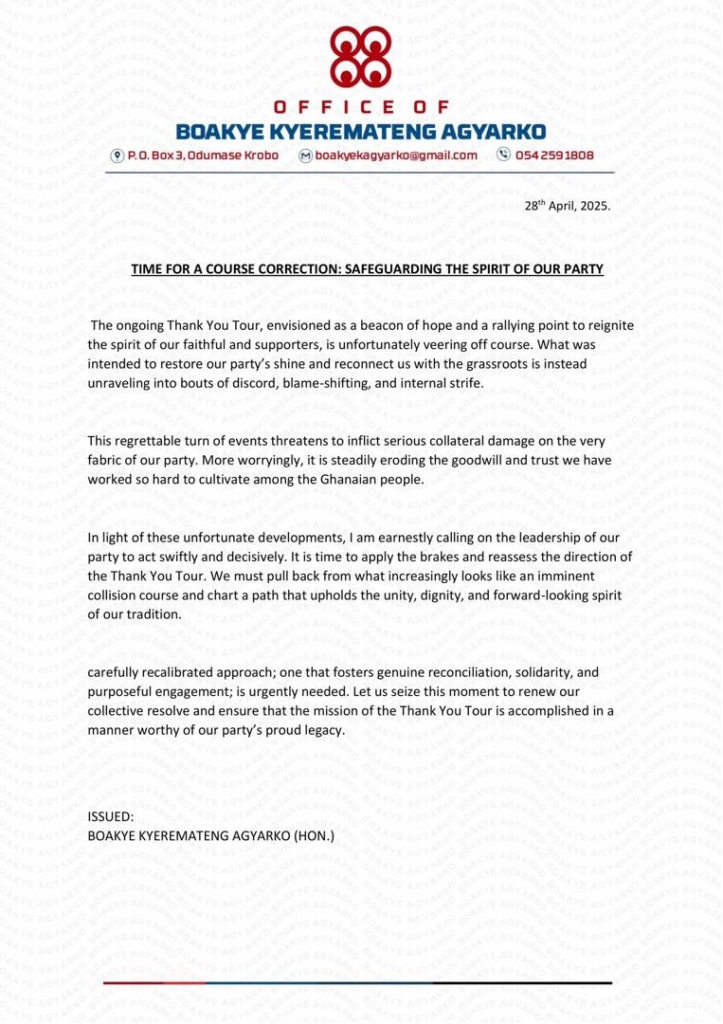 Boakye Kyerematen Agyarko, a former presidential aspirant of the New Patriotic Party (NPP), has voiced grave concerns over the current direction of the party’s ‘Thank You’ Tour, urging its leadership to take immediate steps to realign the initiative with its intended purpose.