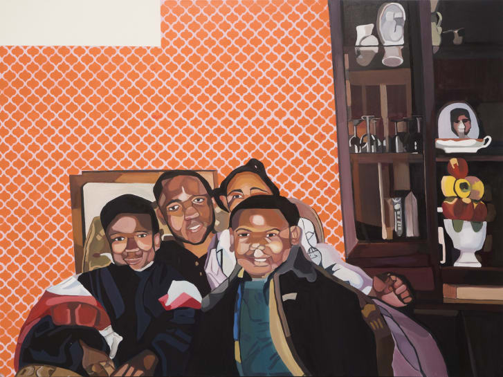 This painting is of her cousins posing for the camera in front of an orange-tiled wall and glass shelves filled with china. It reminds me of my grandmother's home.