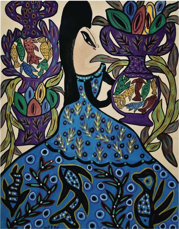 Baya Mahieddine was a self-taught Algerian artist who originally worked as a maid on a farm, immersed in the beauty of nature.