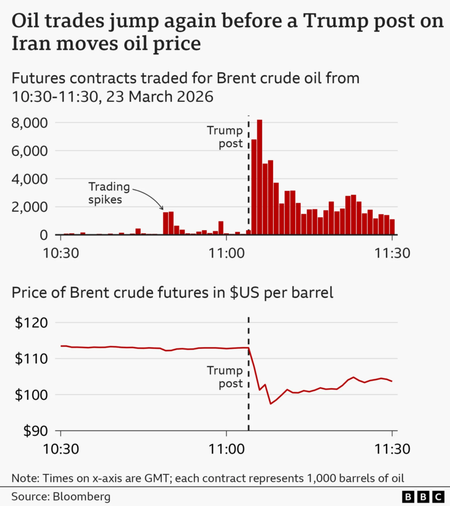 However, market data shows a huge surge of bets were placed on the price of oil falling at 18:29 GMT - a full 47 minutes before the reporter's post.