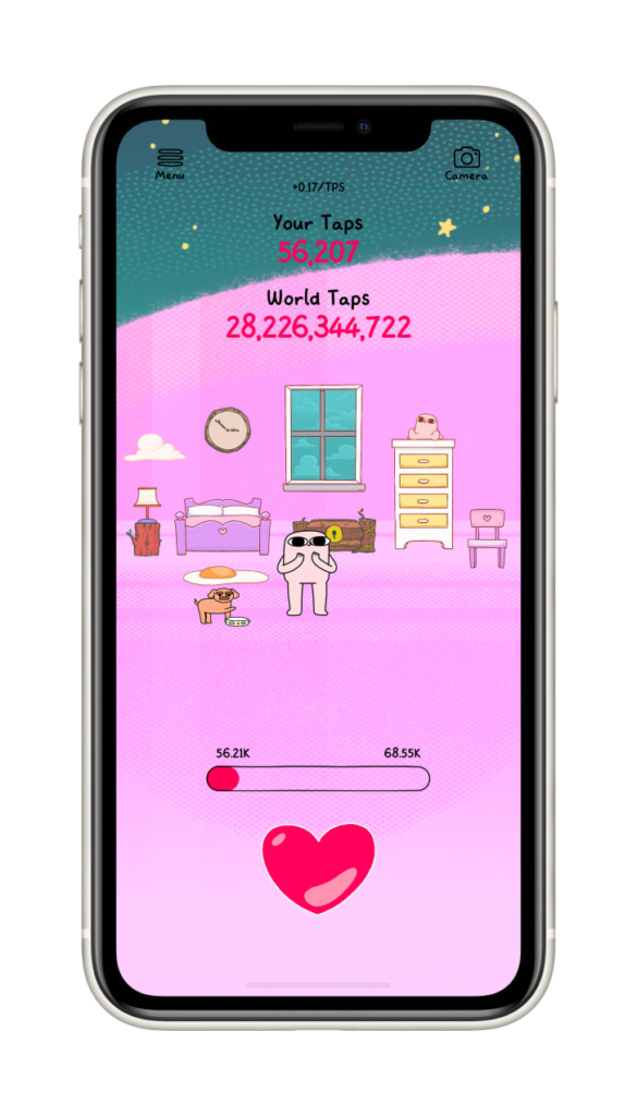 In the app, Bean softly bobs up and down while you tap the heart, change the background illustration or add furniture to decorate your personalized space. As the number of love taps from around the world increases, new characters are "unlocked" -- like a dog or an elderly woman -- to join Bean.