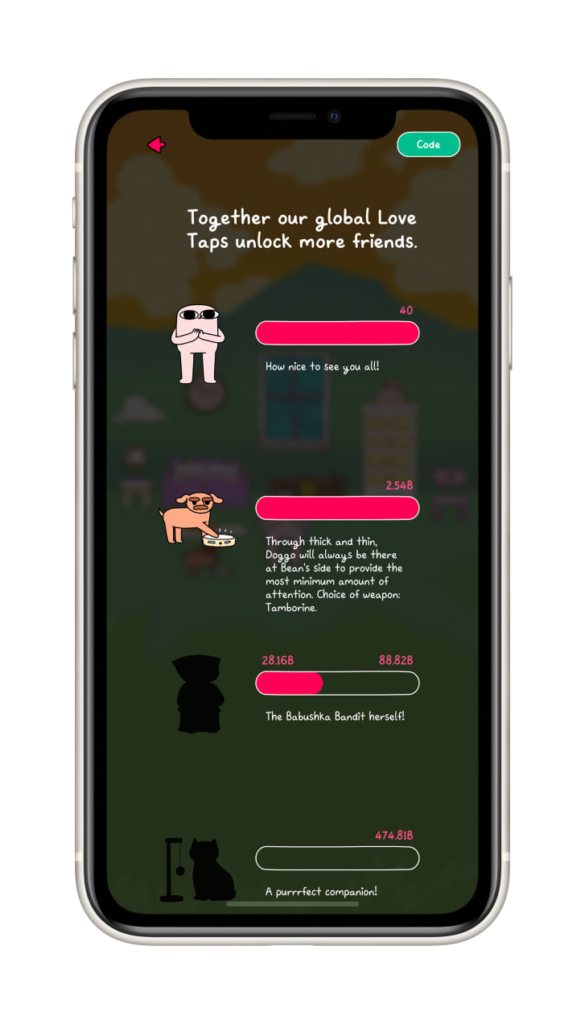 The goal of BeanKind, if it can be said to have a definitive one at all (the game can becategorized as part of the "idle" genre, in which points are earned through simple or repetitive actions), is for users tounlock all of Bean's friends so they can be together. Collectively, this feat will take 43 trillion taps. The app tracks where the love is coming from, with more than half of the 80 billion love taps sent globally coming from the US, at the time of writing