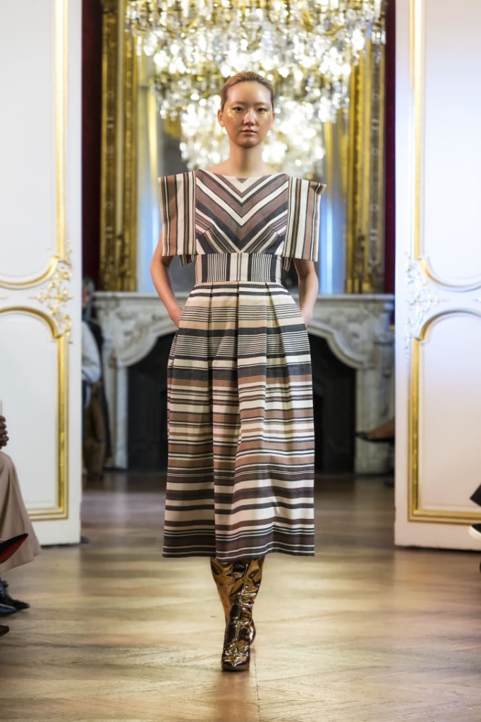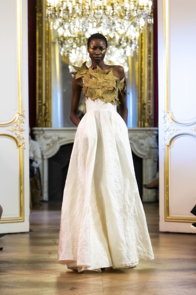 For his couture week debut, Ayissi presented a collection titled "Akuma" ("richness" in the Beti language) to express the idea that true wealth depends on what you do with what you have, be it a little or a lot.