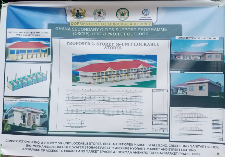 The Dormaa Municipal Tuesday Market will have the construction of 2-storey, 56-unit lockable stores, 14 unit open market stalls, a creche, a sanitary block, a mechanized borehole, fire hydrant, market and street lights, and pavements at a cost of 15 million cedis.