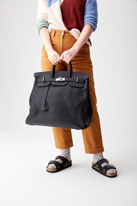Modelled after the Arizona sandal, the hybrid style is made from an official Birkenstock cork-and-rubber sole, with chopped-up Hermès Birkin bags creating the leather straps.