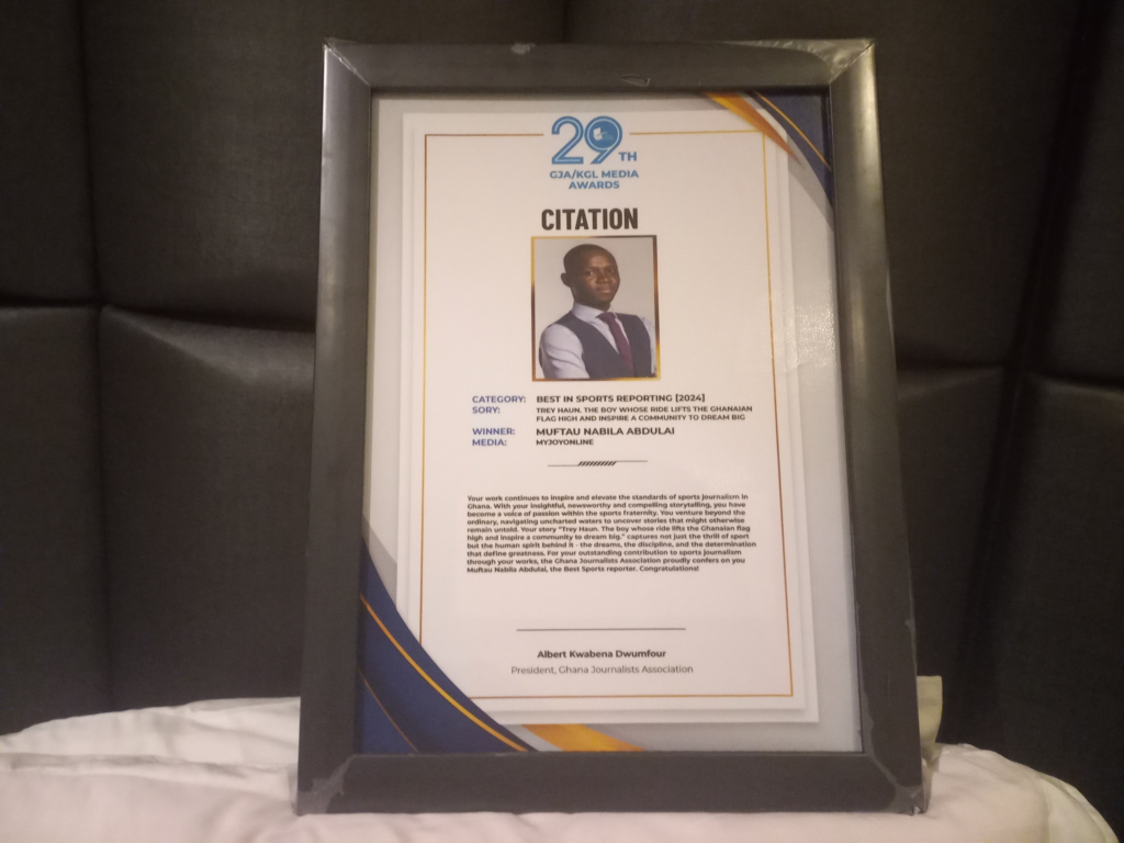 It read: "Your work continues to inspire and elevate the standards of sports journalism in Ghana. With your insightful, newsworthy, and compelling storytelling, you have become a voice of passion within the sports fraternity. For your outstanding contribution to sports journalism through your works, the Ghana Journalists Association proudly confers on you, Muftawu Nabila Abdulai, the Best Sports Reporter. Congratulations!”