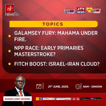 Newsfile airs live on the JoyNews channel on digital satellite channels 421 on DSTV and 144 on GoTV, and streams on JoyNews’ Facebook or YouTube channels on Saturdays from 9 am to noon.