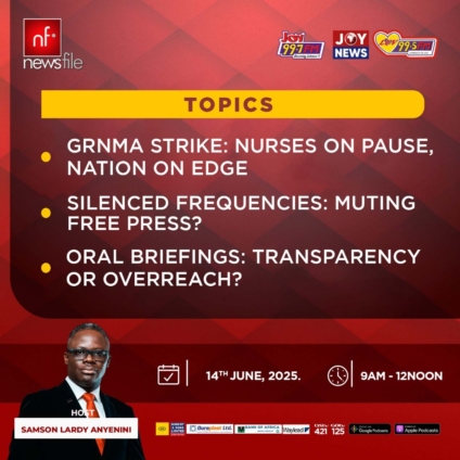 The show will explore the suspension of the GRNMA strike and its implications on healthcare delivery, the shutdown and subsequent reinstatement of 64 radio stations amid media freedom concerns, and the Attorney General’s latest revelations on the ORAL investigation into the National Service Authority scandal.