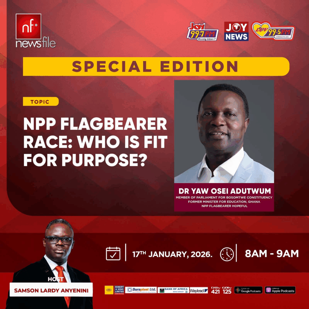 Tomorrow, Newsfile hosts flagbearer hopeful, Dr. Yaw Osei Adutwum, MP for Bosomtwe Constituency and former Minister of Education, as he lays out his vision, ideas, and leadership plan for the party and Ghana as whole. In the discussion titled “NPP Flagbearer Race: Who is Fit for Purpose?”, Dr. Adutwum will share why he believes he is best positioned to lead the party and the nation.
