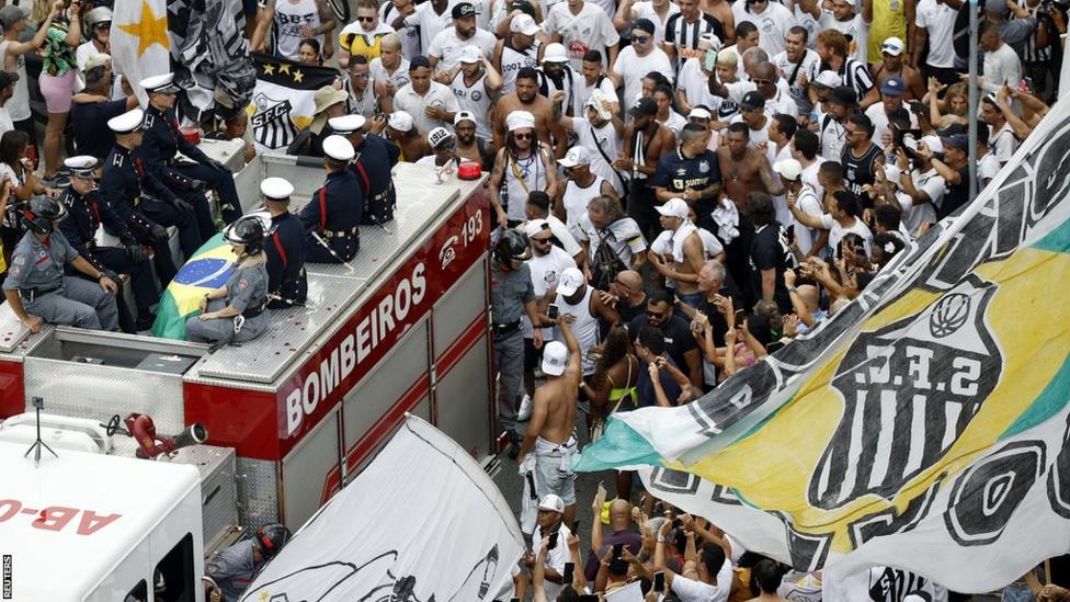 Pele's coffin was paraded through Santos on a fire truck - as is the Brazilian tradition - while fans accompanied the cortege chanting "Pele, 1,000 goals".