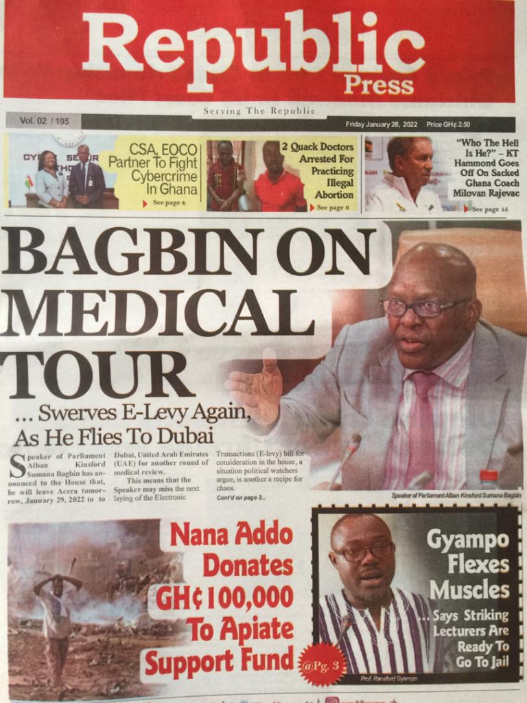 - Bagbin on medical tour, swerves E-levy again as he flies to Dubai