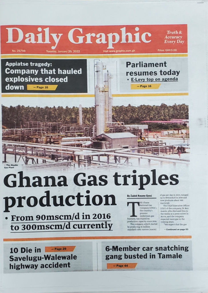 - Ghana Gas triples production from 90mscm/d in 2016 to 300mscm/d currently