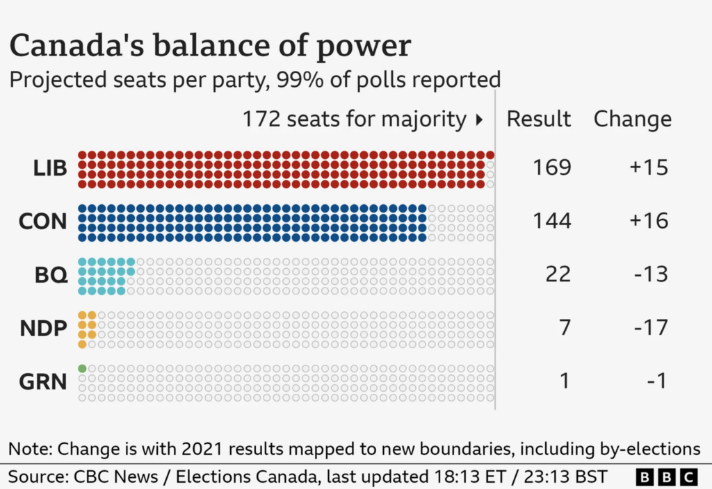 The Liberals are projected to have won 169 seats, three short of the 172 needed for a majority in Canada's House of Commons.