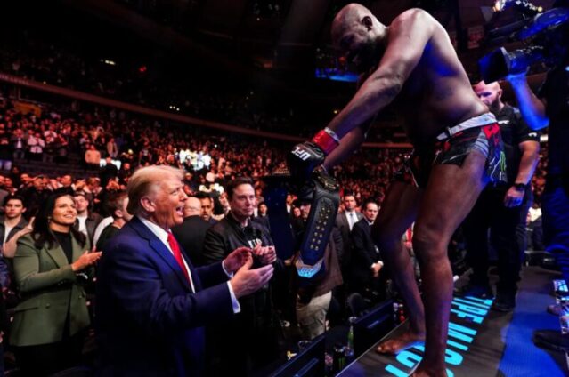 Jon Jones, who retained his heavyweight UFC title, then celebrated by heading over to greet Trump, handing the president-elect his title.