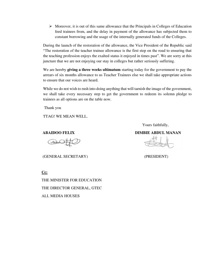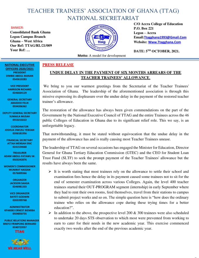 In a press release dated October 5, 2021, the Teacher Trainees' Association of Ghana (TTAG) recounted that several attempts they have made to get their issues addressed have all proven futile.