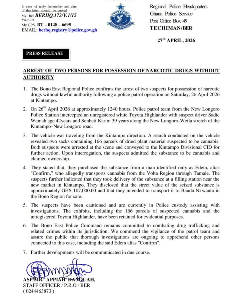 The Ghana Police Service has confirmed the arrest of two men in the Bono East Region for possession of suspected narcotic substances, following a routine patrol operation that led to the seizure of a significant quantity of cannabis.