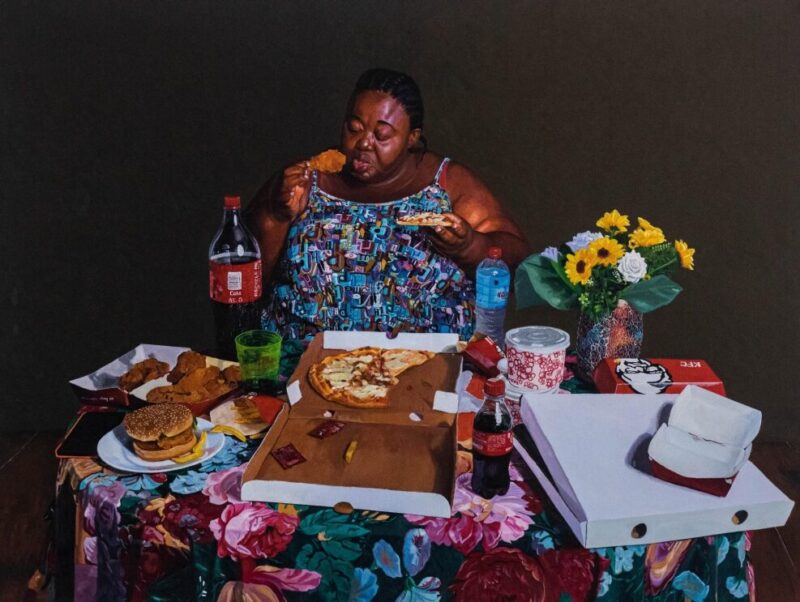 His emphasis on communal meals, like Fufu and Tilapia, reminds viewers of the joy and identity embedded in traditional foods. Dzade also doesn’t shy away from environmental issues, as seen in his work Take Away, which critiques the environmental consequences of single-use plastics in food packaging.