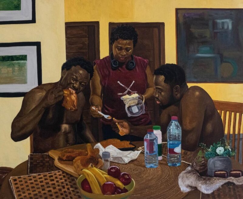 Kingsley Sedem Dzade’s exhibition, Mi na miadu nu ("Let’s gather and eat"), meanwhile, is an introspective social commentary on the significance of food in Ghanaian society. Through commensality — the act of eating together — Dzade reflects on the traditional values that have historically underpinned Ghanaian culinary culture.