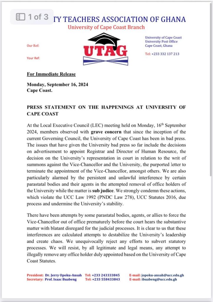 The University of Cape Coast branch of the University Teachers Association (UTAG) has raised concerns over the ongoing leadership crisis and external interference in the institution's governance.