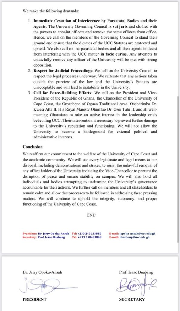 UTAG averred that "We call on the members of the Governing Council to stand their ground and ensure that the dictates of the UCC Statutes are protected and upheld," they said, warning that any attempts to unlawfully remove any university officer would be met with strong opposition.