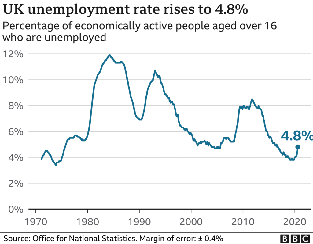 The UK's unemployment rate rose to 4.8% in the three months to September, up from 4.5% as coronavirus continued to hit the jobs market.