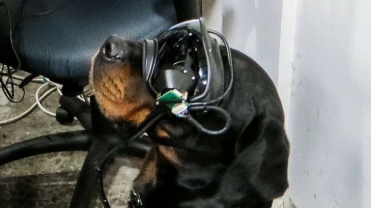 Inside the goggles, the dogs can see a visual indicator that they can be trained to follow, directing them to a specific spot.